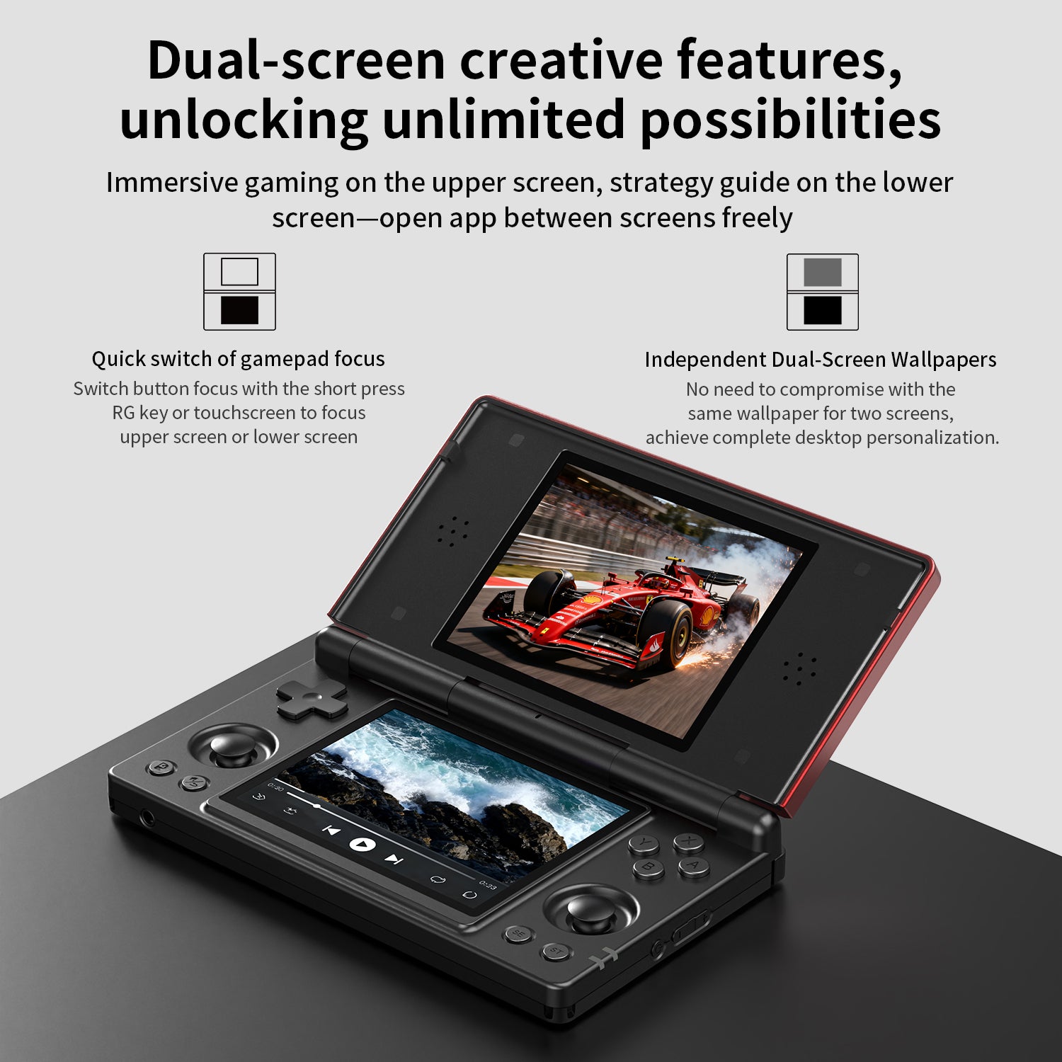 The RG DS features dual screens with a capacitive stylus, delivering a seamless and immersive portable gaming experience. Easily switch key focus between the upper and lower screens, or run dual applications on split screens for multitasking convenience.